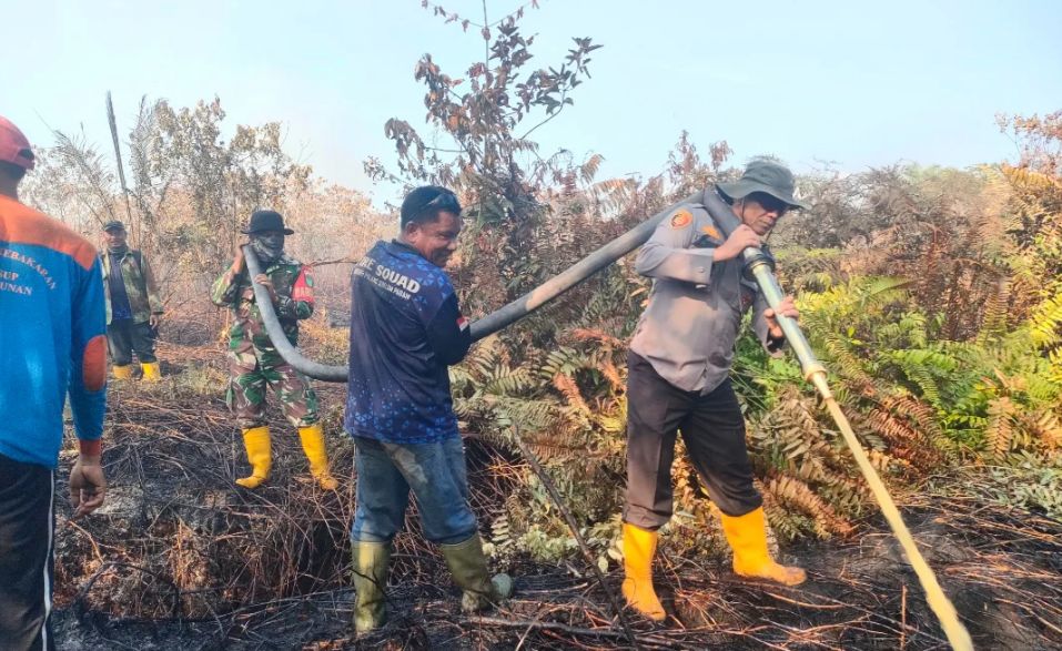 INDRAGIRI HILIR, (Swarabuana.com) – Jajaran Kepolisian Sektor (Polsek) Pulau Burung bersama unsur Pimpinan Kecamatan (Forkopimcam) dan PT RSUP Pulau Burung melaksanakan aksi cepat tanggap pemadaman serta pendinginan (cooling down) titik api di wilayah rawan Kebakaran Hutan dan Lahan (Karhutla), Rabu (11/02/2026). Langkah ini diambil untuk memastikan titik api tidak meluas dan meminimalisir dampak kabut asap.
