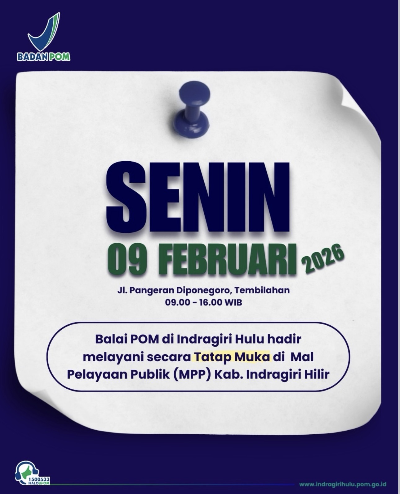 INHIL, (Swarabuana.com) – Dalam upaya mempercepat akses layanan publik dan mendukung pelaku usaha lokal, Balai Pengawas Obat dan Makanan (BPOM) di Indragiri Hulu kembali menyelenggarakan layanan konsultasi tatap muka langsung di Mal Pelayanan Publik (MPP) Kabupaten Indragiri Hilir pada hari ini, Senin (9/2).