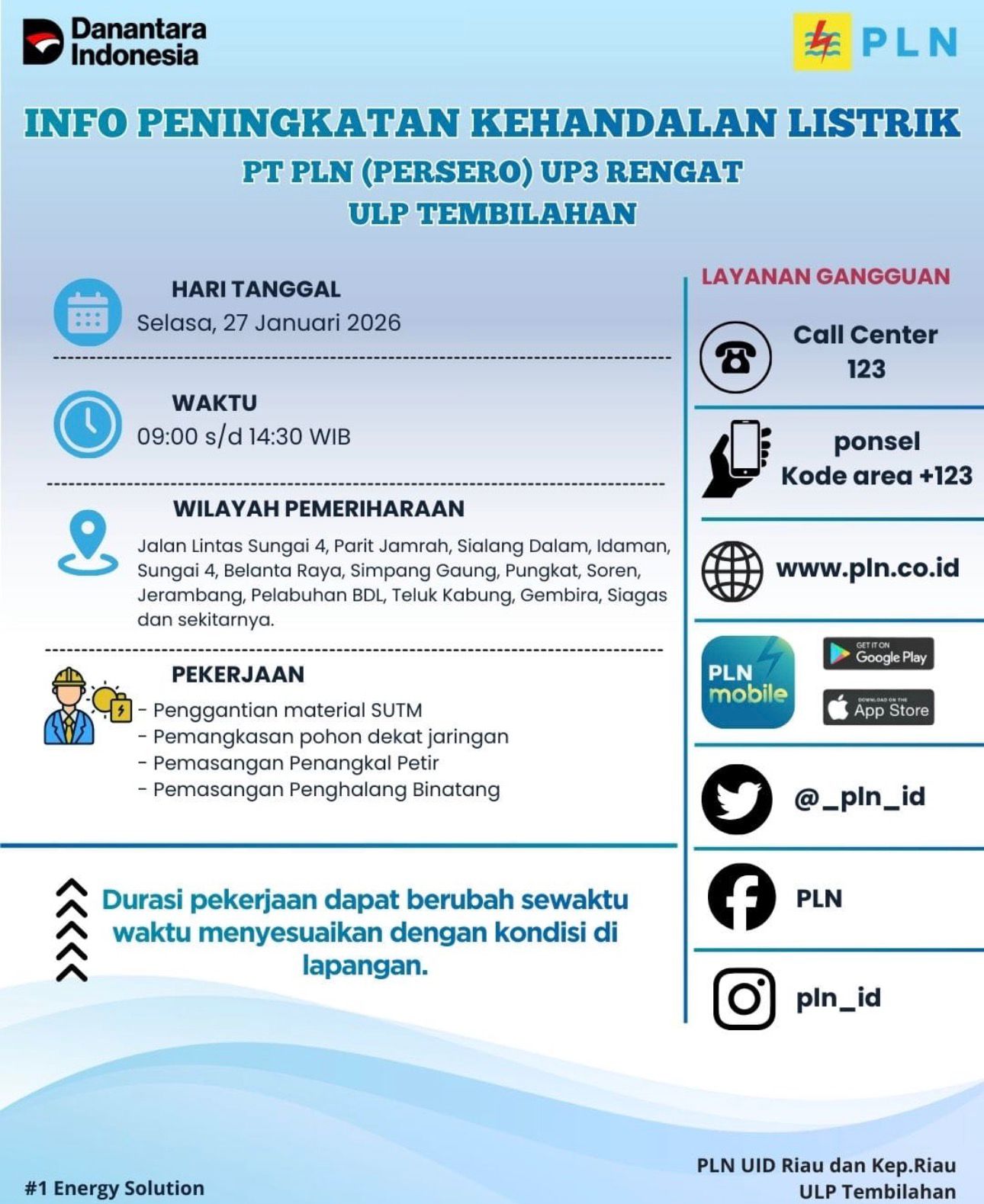 TEMBILAHAN, (Swarabuana.com) – PT PLN (Persero) Unit Pelaksana Pelayanan Pelanggan (UP3) Rengat melalui Unit Layanan Pelanggan (ULP) Tembilahan menjadwalkan pemeliharaan jaringan listrik pada Selasa, 27 Januari 2026.