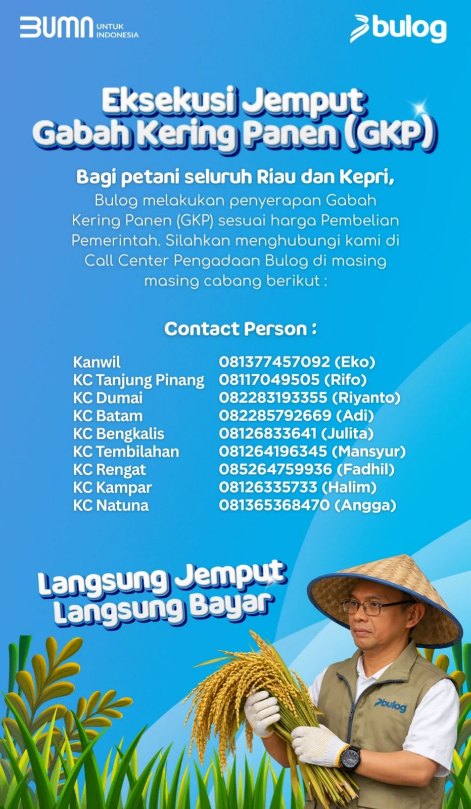 Untuk memudahkan koordinasi, Bulog Tembilahan membuka kanal komunikasi langsung. Bagi petani atau kelompok tani di wilayah Tembilahan yang ingin menjual hasil panennya, dapat menghubungi kontak resmi berikut: