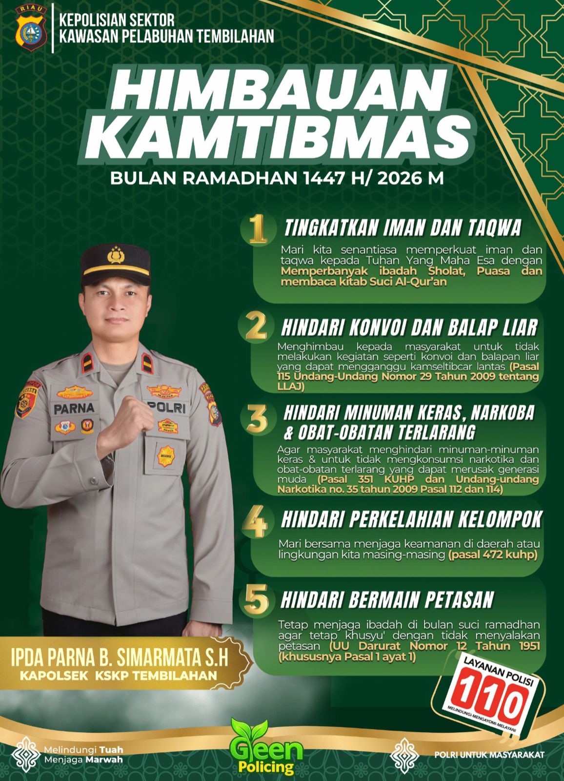 TEMBILAHAN, (Swarabuana.com) – Guna memastikan kekhusyukan masyarakat dalam menjalankan ibadah di bulan suci Ramadan 1447 H / 2026 M, Kepolisian Sektor (Polsek) Kawasan Pelabuhan (KSKP) Tembilahan, Polres Indragiri Hilir (Inhil), resmi merilis imbauan Keamanan dan Ketertiban Masyarakat (Kamtibmas). Langkah ini diambil sebagai upaya preventif menjaga kondusivitas wilayah pelabuhan dan sekitarnya.