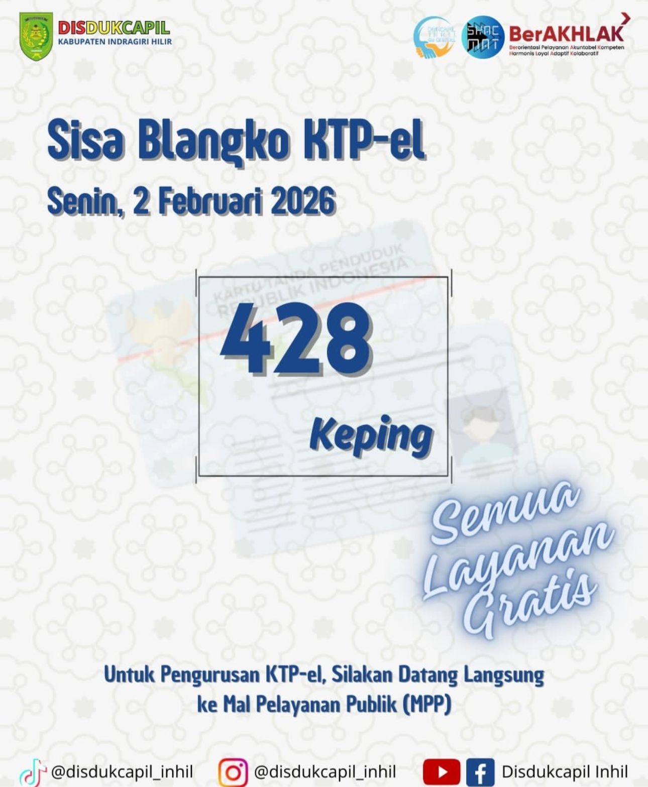 Disdukcapil Inhil Umumkan Sisa Blangko KTP-el Per 2 Februari 2026, Pastikan Layanan Gratis dan Transparan