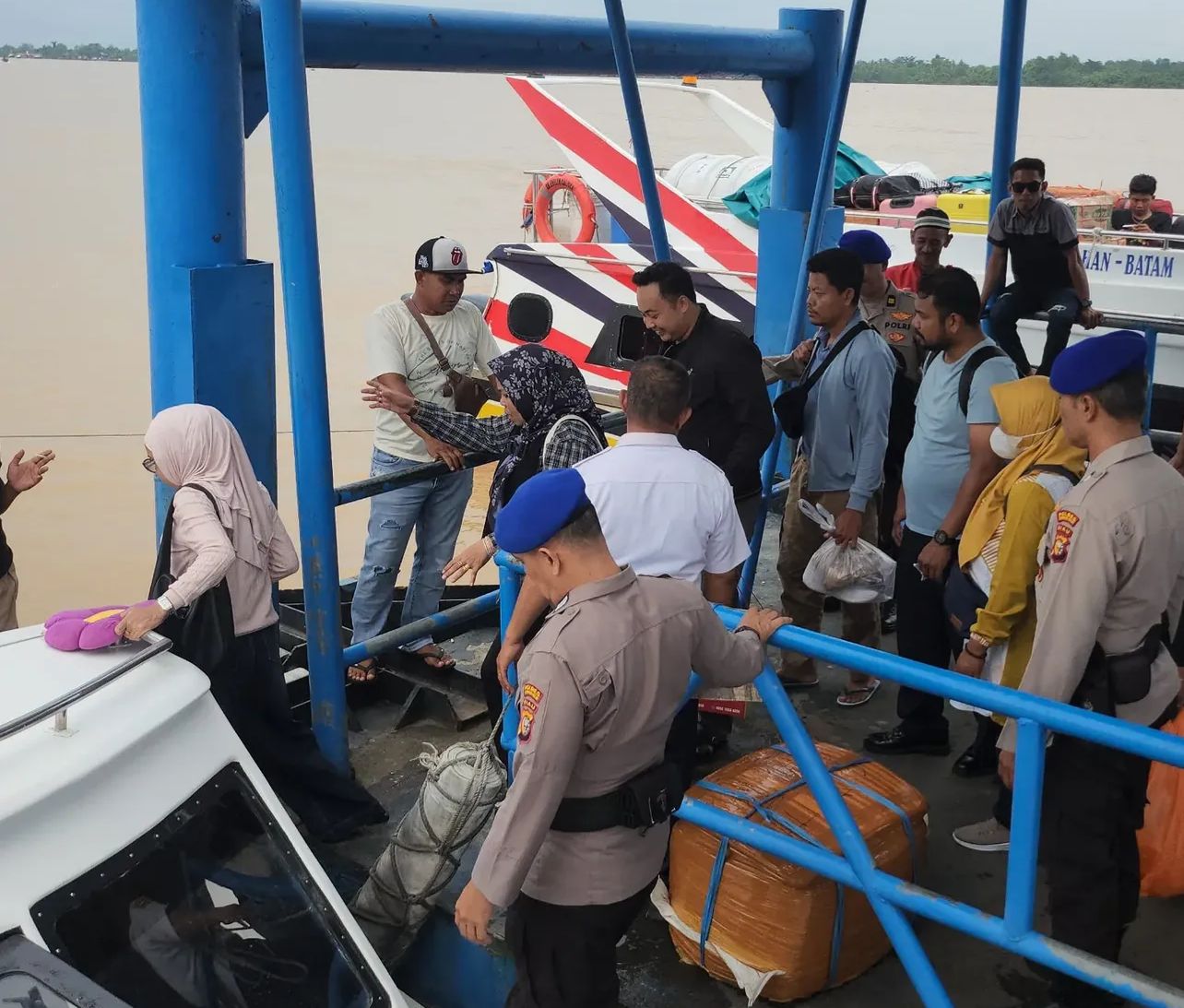 Dalam pantauan di lapangan, personel kepolisian tampak memeriksa aktivitas bongkar muat barang serta memantau pergerakan penumpang yang akan menggunakan transportasi air.