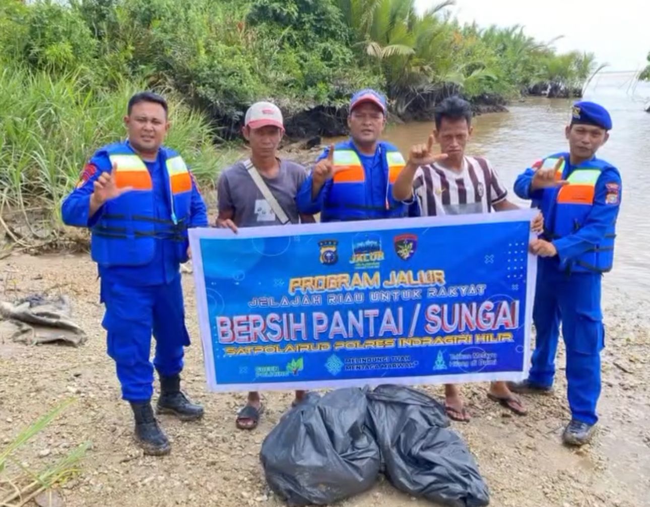 “Gencar Dukung Program JALUR Bapak Kapolda Riau di wilayah hukum Polres Inhil. Hari ini, personel Satpolairud turun langsung membersihkan sampah di area bibir pantai dan aliran sungai guna memastikan lingkungan perairan tetap asri dan sehat,” ujar IPTU Imbang Perdana.