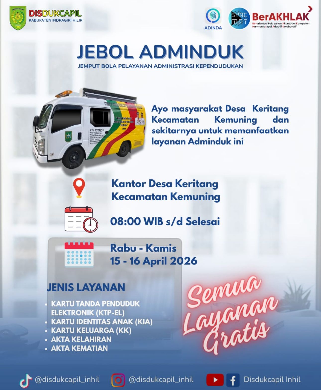 Layanan terintegrasi ini dijadwalkan menyambangi masyarakat di Desa Keritang, Kecamatan Kemuning, pada Rabu dan Kamis, 15-16 April 2026.