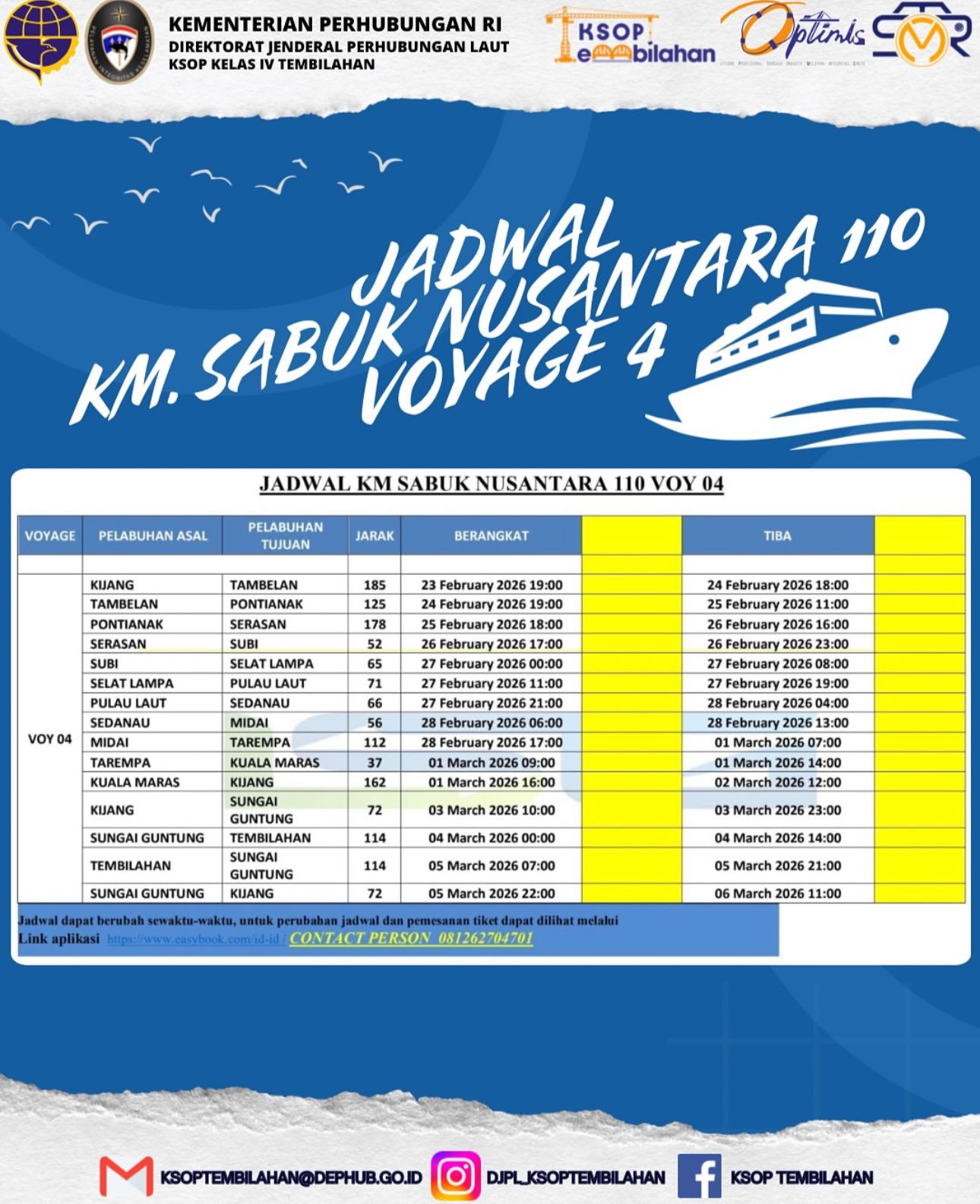 TEMBILAHAN, (Swarabuana.com) – Kantor Kesyahbandaran dan Otoritas Pelabuhan (KSOP) Kelas IV Tembilahan secara resmi mengumumkan perubahan jadwal operasional Kapal Motor (KM) Sabuk Nusantara 110 untuk Voyage 04 Tahun 2026. Langkah ini diambil sebagai respons cepat terhadap kondisi cuaca ekstrem yang dinilai dapat berisiko terhadap keselamatan pelayaran di sejumlah rute lintasan.