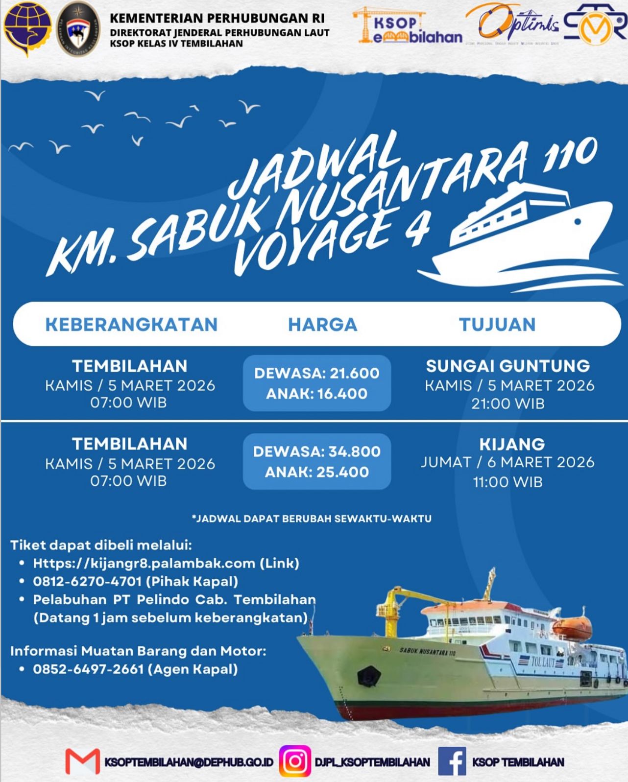 Berdasarkan jadwal terbaru yang telah diverifikasi, KM Sabuk Nusantara 110 dijadwalkan akan bertolak dari Pelabuhan Tembilahan pada Kamis, 5 Maret 2026, pukul 07:00 WIB.