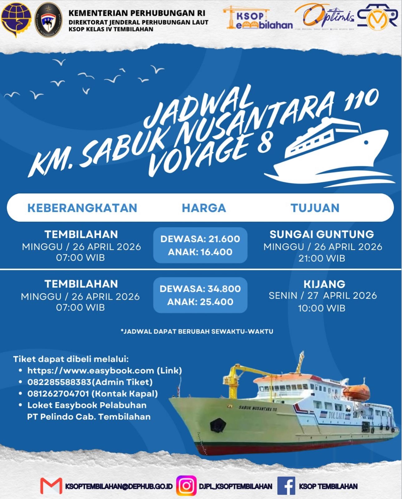 TEMBILAHAN, (Swarabuana.com) – Kantor Kesyahbandaran dan Otoritas Pelabuhan (KSOP) Kelas IV Tembilahan resmi merilis jadwal operasional kapal perintis KM Sabuk Nusantara 110 untuk Voyage 8 tahun 2026.
