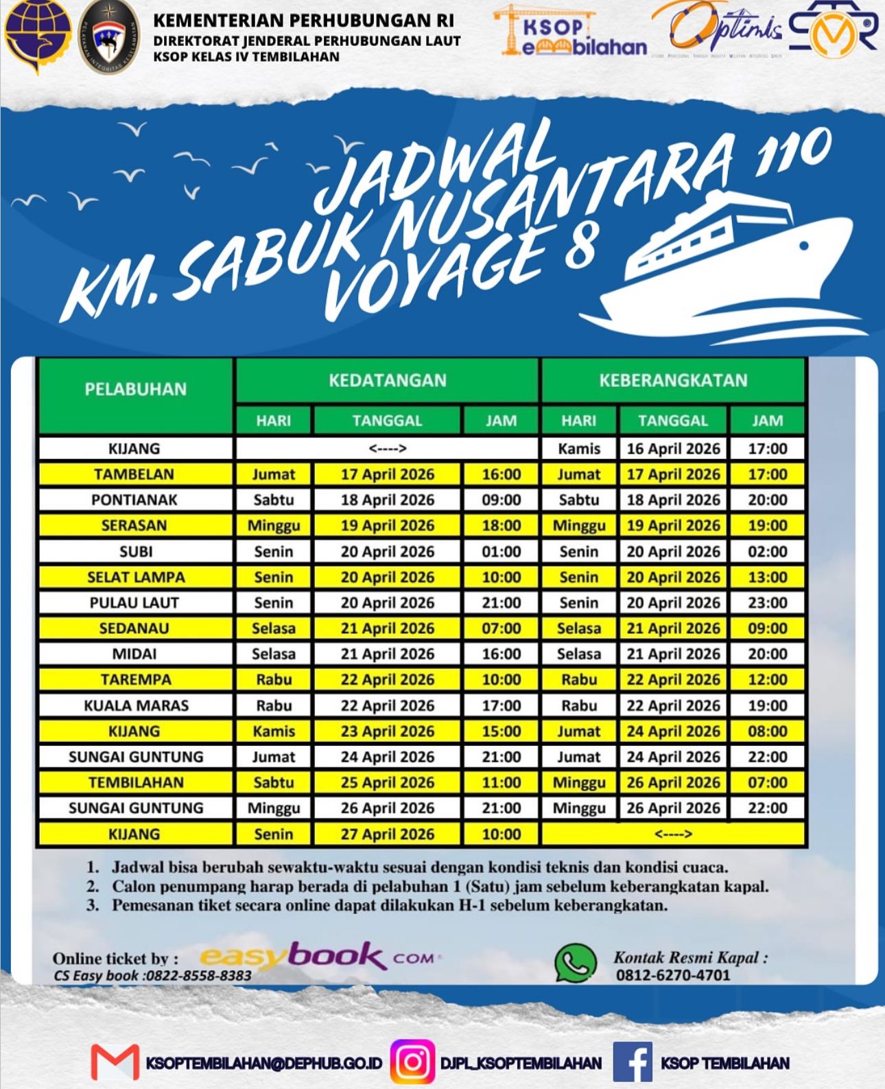 TEMBILAHAN, (Swarabuana.com) – Kantor Kesyahbandaran dan Otoritas Pelabuhan (KSOP) Kelas IV Tembilahan resmi merilis jadwal operasional kapal perintis KM Sabuk Nusantara 110 untuk Voyage 8 tahun 2026.