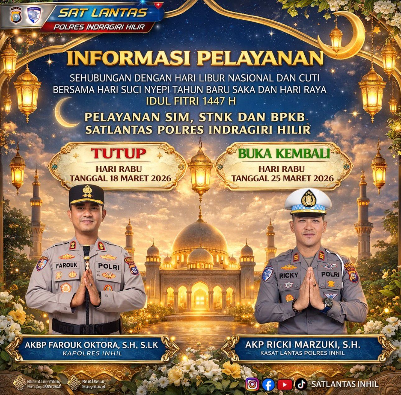 “Sehubungan dengan Hari Libur Nasional dan Cuti Bersama Hari Suci Nyepi Tahun Baru Saka dan Hari Raya Idul Fitri 1447 H, kami informasikan bahwa pelayanan SIM, STNK, dan BPKB Satlantas Polres Indragiri Hilir tutup mulai Rabu, 18 Maret 2026,” ujar AKP Ricki Marzuki, S.H., dalam keterangan tertulisnya.