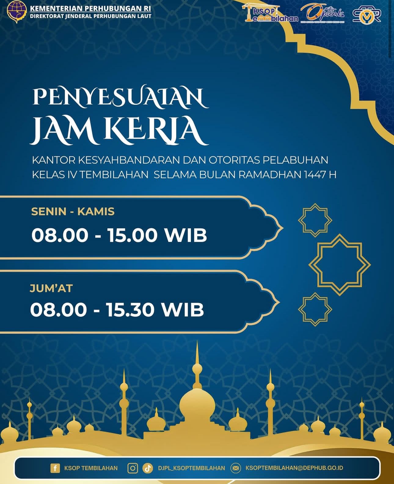 Berdasarkan pengumuman tersebut, rincian jam kerja pelayanan operasional Kantor KSOP Kelas IV Tembilahan selama bulan Ramadhan 1447 H adalah sebagai berikut: