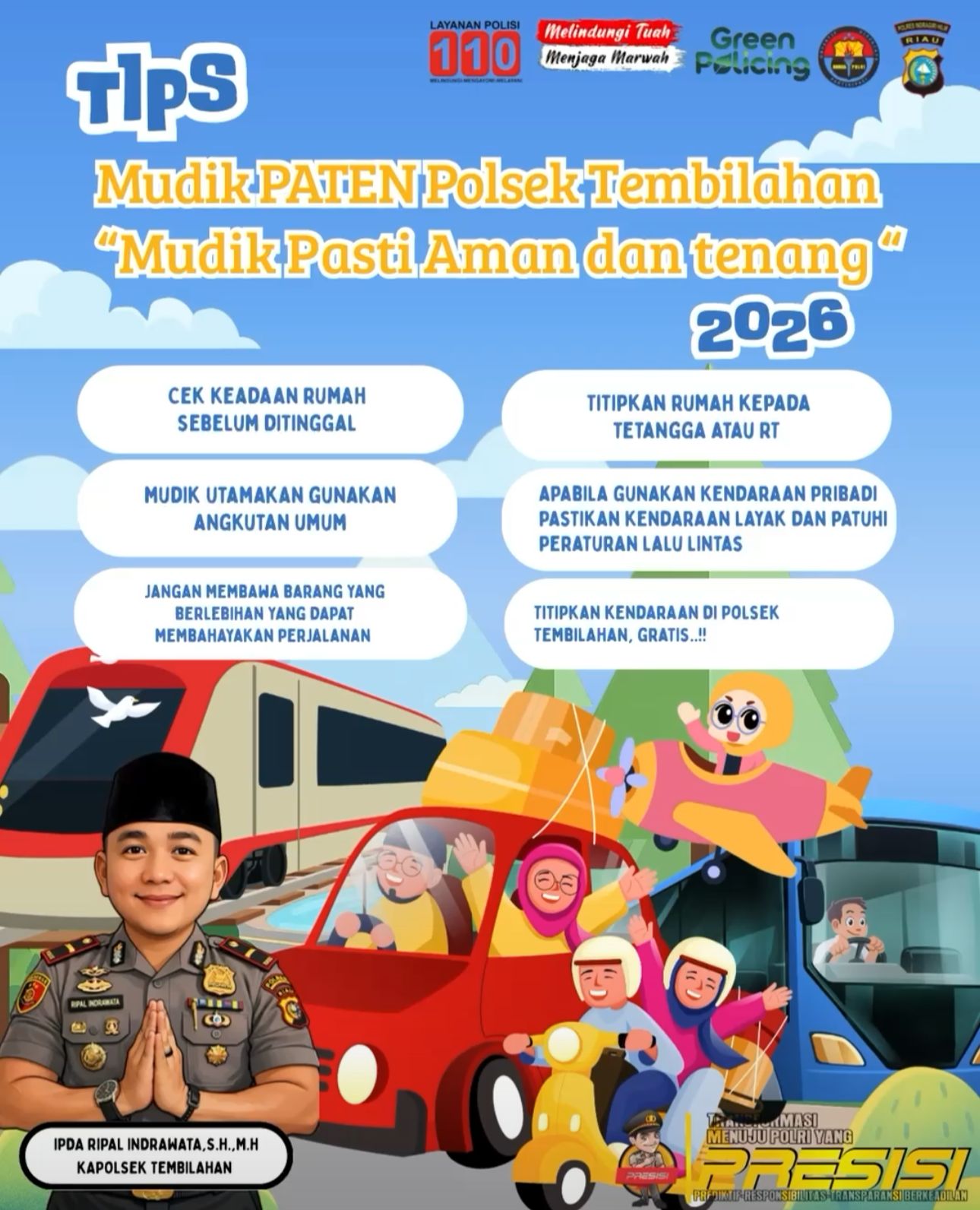 TEMBILAHAN, (Swarabuana.com) – Menjelang musim mudik Lebaran 2026, Kepolisian Sektor (Polsek) Tembilahan resmi meluncurkan program inovatif bertajuk “Mudik PATEN” (Mudik Pasti Aman dan Tenang). Inisiatif ini dirancang untuk memberikan rasa aman bagi masyarakat yang akan meninggalkan kediamannya menuju kampung halaman, sekaligus menekan angka kriminalitas dan kecelakaan lalu lintas di wilayah hukum Tembilahan.