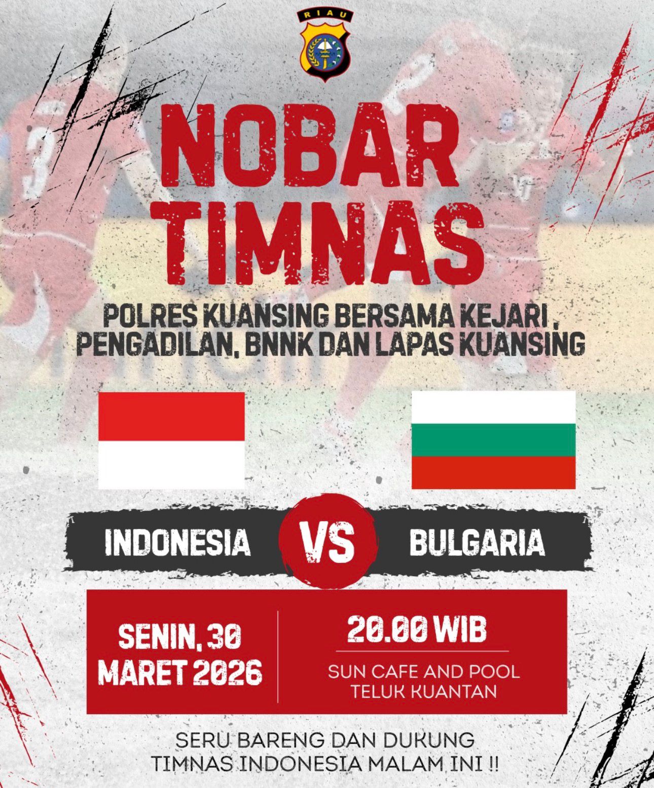 Kuansing, (Swarabuana.com)– Kepolisian Resor (Polres) Kuantan Singingi (Kuansing) mengadakan kegiatan nonton bareng (nobar) pertandingan sepak bola antara Tim Nasional (Timnas) Indonesia melawan Bulgaria. Acara ini diselenggarakan pada Senin (30/03/2026) pukul 20.00 WIB di Sun Cafe and Pool, Teluk Kuantan.
