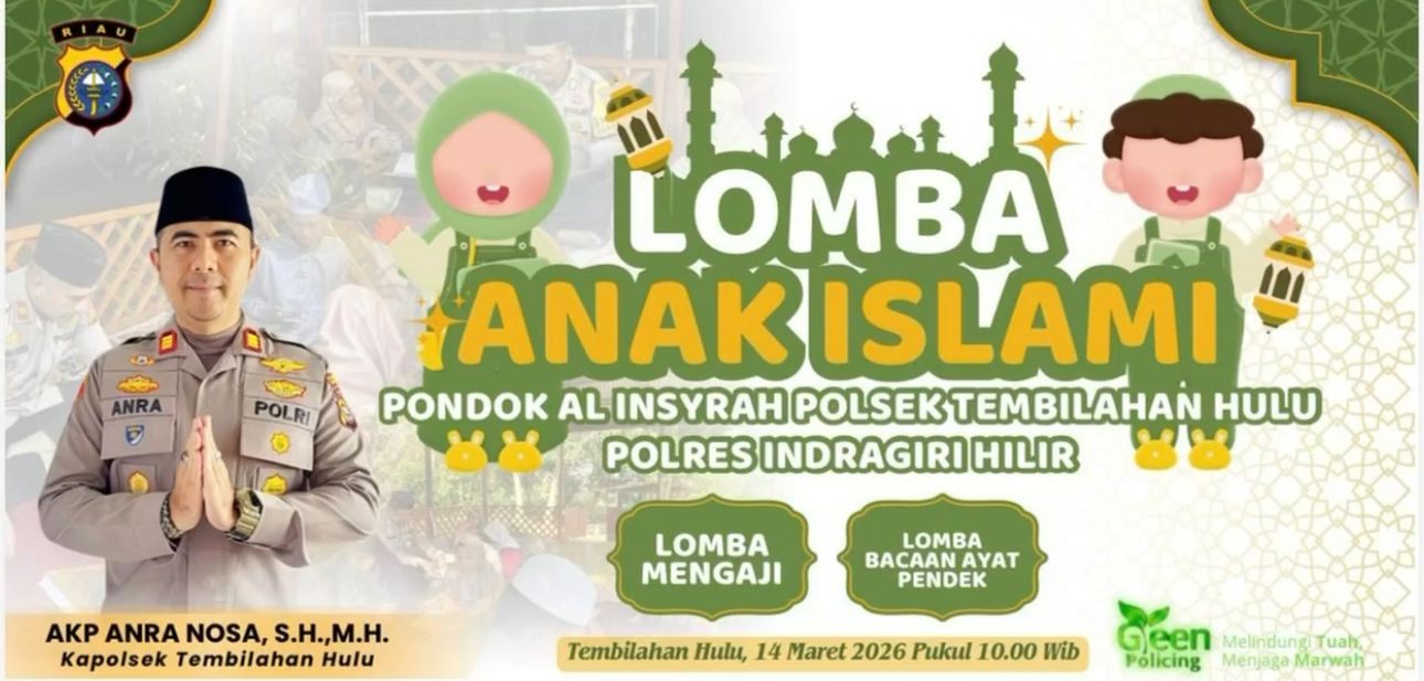 TEMBILAHAN HULU, (Swarabuana.com) – Dalam upaya membina karakter dan mentalitas religius sejak dini, Kepolisian Sektor (Polsek) Tembilahan Hulu, Polres Indragiri Hilir, menyelenggarakan kegiatan “Lomba Anak Islami”. Acara yang berlangsung di Pondok Al Insyrah Polsek Tembilahan Hulu ini dimulai pada Sabtu (14/03/2026) pagi pukul 10.00 WIB.