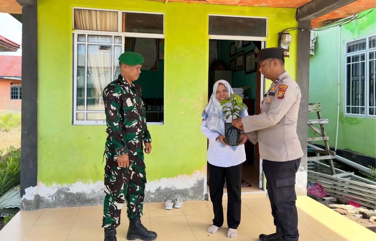 Dalam kegiatan tersebut, personel kepolisian bersinergi dengan unsur TNI untuk menyerahkan langsung bibit tanaman produktif kepada warga.