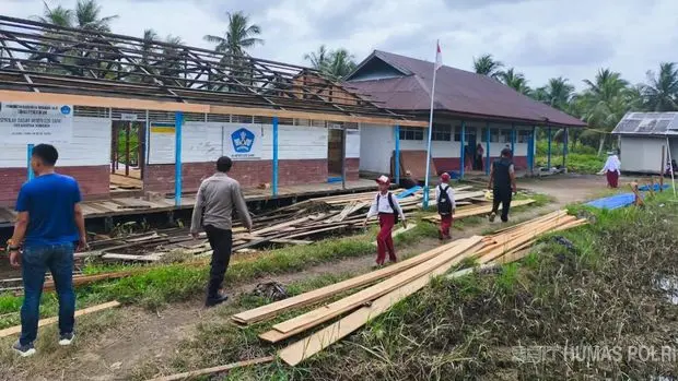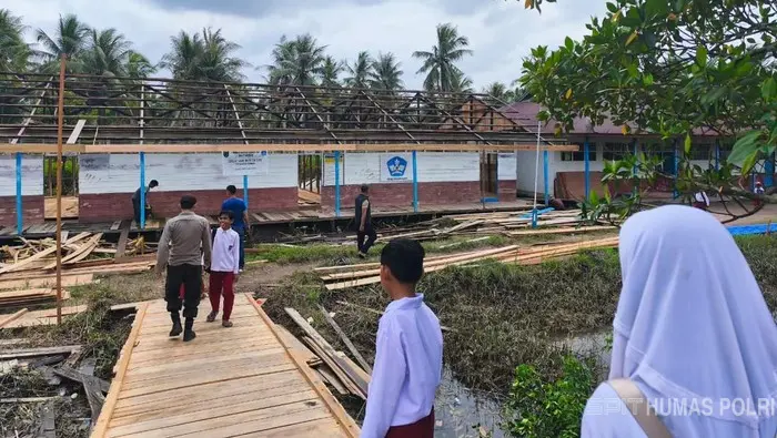 Di sekolah yang berada di daerah terpencil tersebut, personel Satbrimob Polda Riau bersama Polres Inhil tengah melakukan perbaikan bangunan sekolah yang mengalami kerusakan parah serta akses jembatan menuju sekolah yang sebelumnya dalam kondisi membahayakan.
