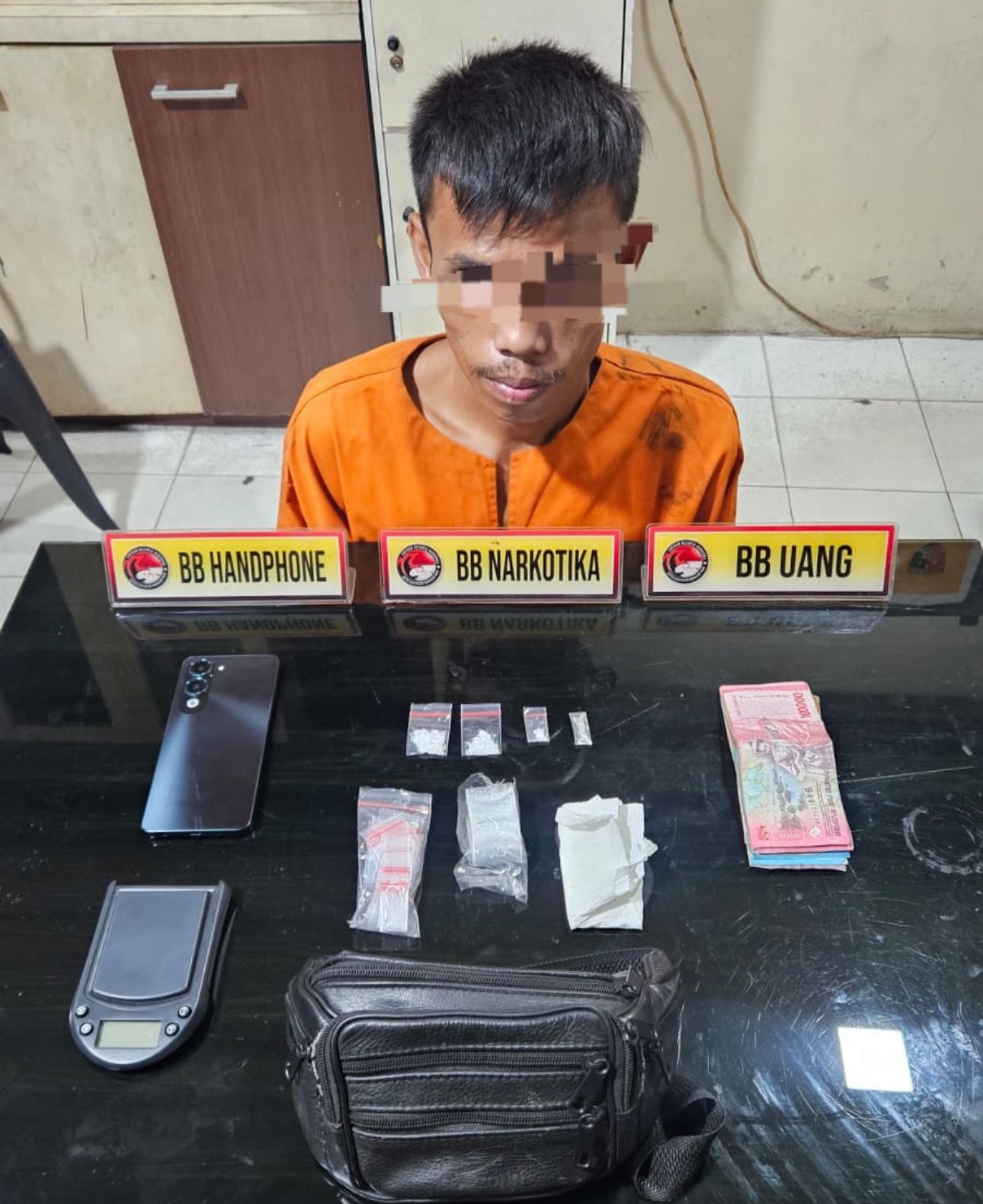 Selain itu, turut diamankan satu buah tas hitam bertuliskan SEA-ZONN, satu unit timbangan digital, uang tunai sebesar Rp500.000,- serta satu unit handphone merk Vivo warna hitam yang diduga digunakan untuk transaksi.