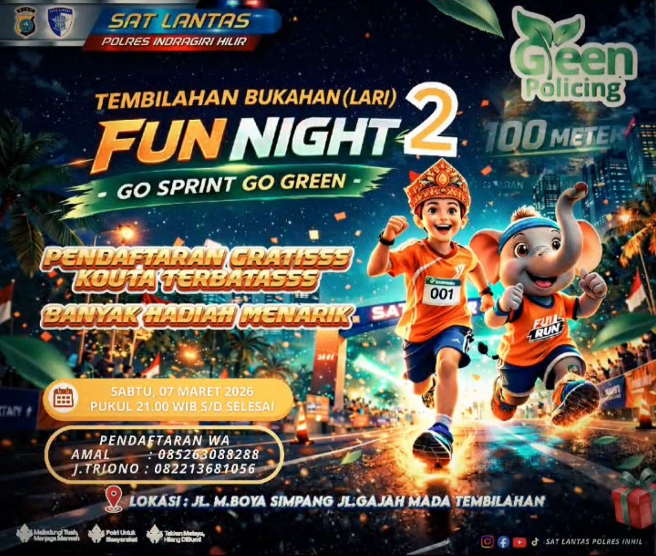 INHIL, (Swarabuana.com) – Satuan Lalu Lintas (Satlantas) Polres Indragiri Hilir (Inhil) resmi mengumumkan penyelenggaraan event “Tembilahan Bukahan (Lari) Fun Night 2”. Mengusung tema “Go Sprint Go Green”, ajang lari malam sejauh 100 meter ini akan dipusatkan di jantung Kota Tembilahan.