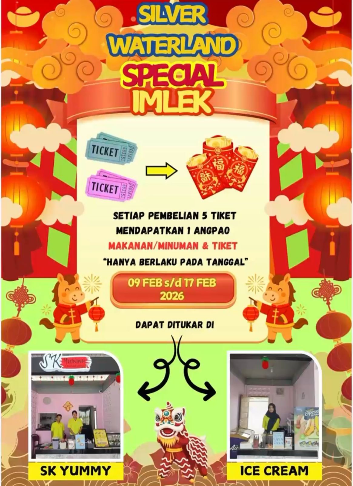 Program ini diharapkan dapat meningkatkan antusiasme masyarakat untuk mengisi waktu libur panjang Imlek bersama keluarga di Silver Waterland. Dengan suasana dekorasi khas oriental dan berbagai tenant kuliner yang siap melayani, Silver Waterland berkomitmen memberikan pengalaman rekreasi yang seru dan kompetitif bagi warga sekitar maupun wisatawan luar kota.