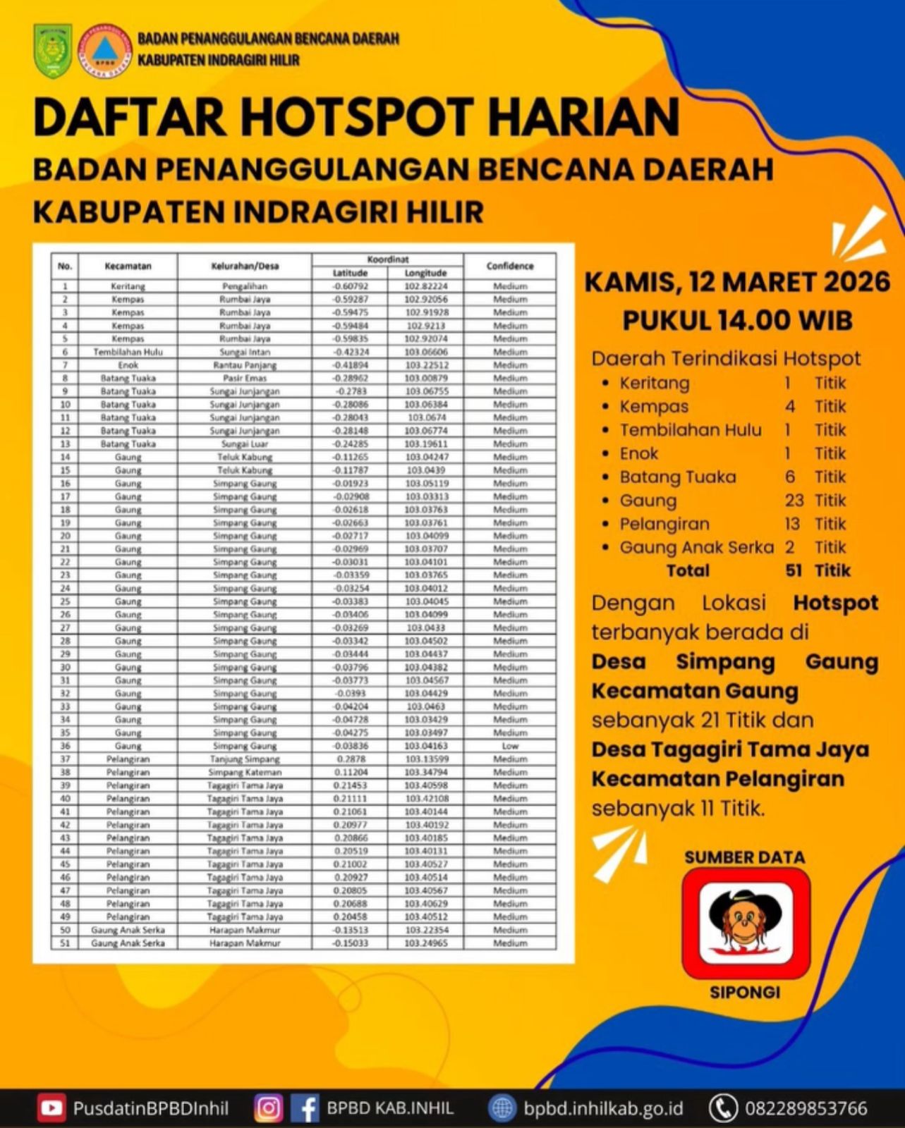 TEMBILAHAN, (Swarabuana.com) – Badan Penanggulangan Bencana Daerah (BPBD) Kabupaten Indragiri Hilir (Inhil) mengeluarkan peringatan dini terkait peningkatan aktivitas titik panas (hotspot) di wilayahnya. Berdasarkan pantauan data SIPONGI pada Kamis (12/3/2026) pukul 14.00 WIB, tercatat sebanyak 51 titik hotspot tersebar di delapan kecamatan di Indragiri Hilir.