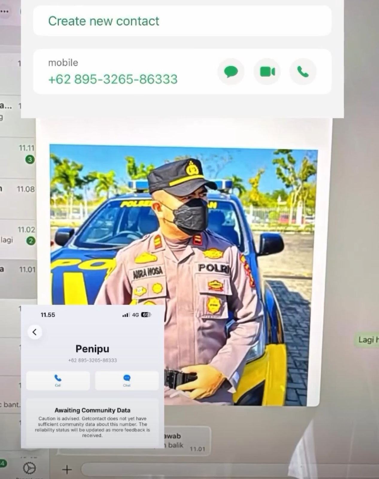 Berdasarkan temuan digital, pelaku menggunakan nomor seluler +62 895-3265-86333 dengan memasang foto AKP Anra Nosa mengenakan seragam dinas lengkap di depan kendaraan patroli. Melalui aplikasi pelacak identitas nomor telepon, kontak tersebut telah ditandai secara luas oleh masyarakat sebagai akun penipu (scammer).