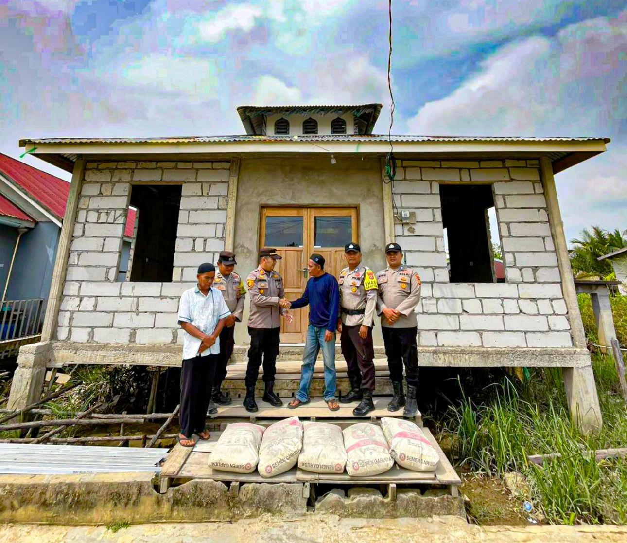 Kapolsek Tembilahan Hulu, AKP Anra Nosa, S.H., M.H., secara langsung menyerahkan bantuan material berupa semen untuk pembangunan Majelis Taklim Nurul Iman, Selasa (24/02/2026).
