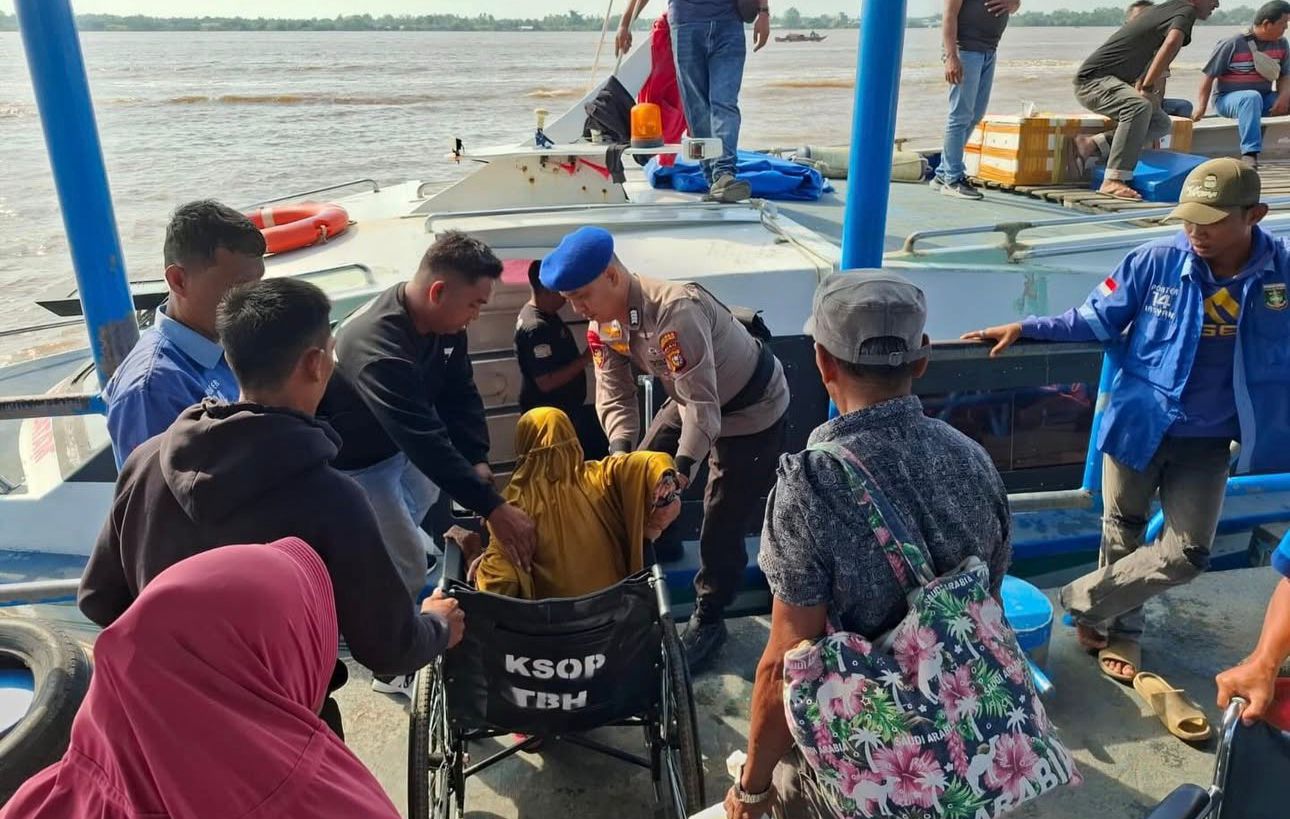 INHIL, (Swarabuana.com) – Personel Satpolairud Polres Indragiri Hilir (Inhil) menunjukkan aksi humanis dengan membantu penumpang yang kesulitan atau berkebutuhan khusus maupun lansia yang hendak menaiki transportasi kapal di Pelabuhan Pelindo Tembilahan, Selasa (10/2).