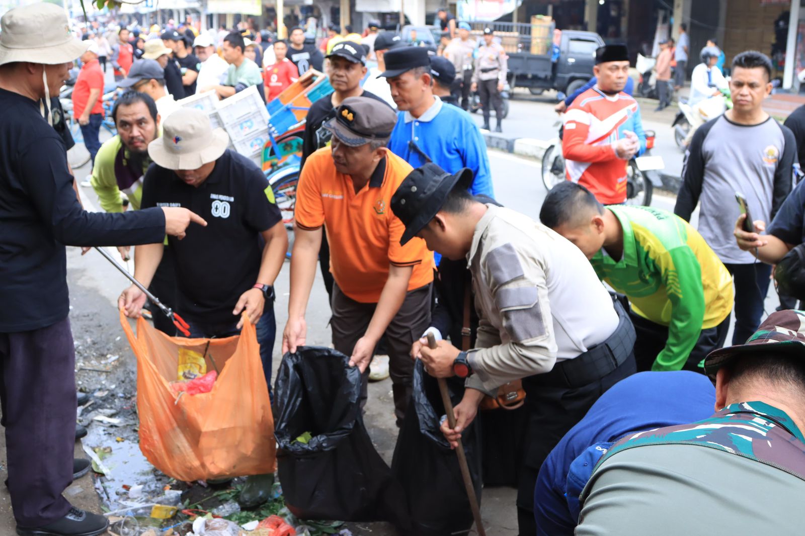 Usai pelaksanaan apel gabungan yang berlangsung khidmat, Sugito, S.H. bersama jajaran Forkopimda turun langsung memantau dan mengikuti jalannya gotong royong di sejumlah titik vital di Kecamatan Tembilahan, meliputi: