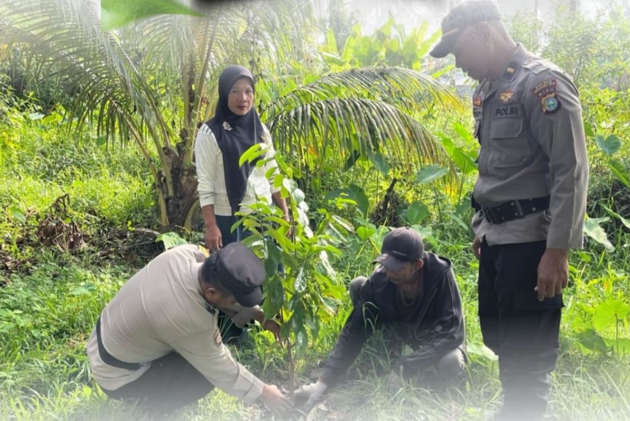 Dalam pelaksanaannya, personel Polsek Tembilahan Hulu bersama perangkat desa dan warga setempat menanam sejumlah bibit pohon di area strategis sekitar perkantoran desa.