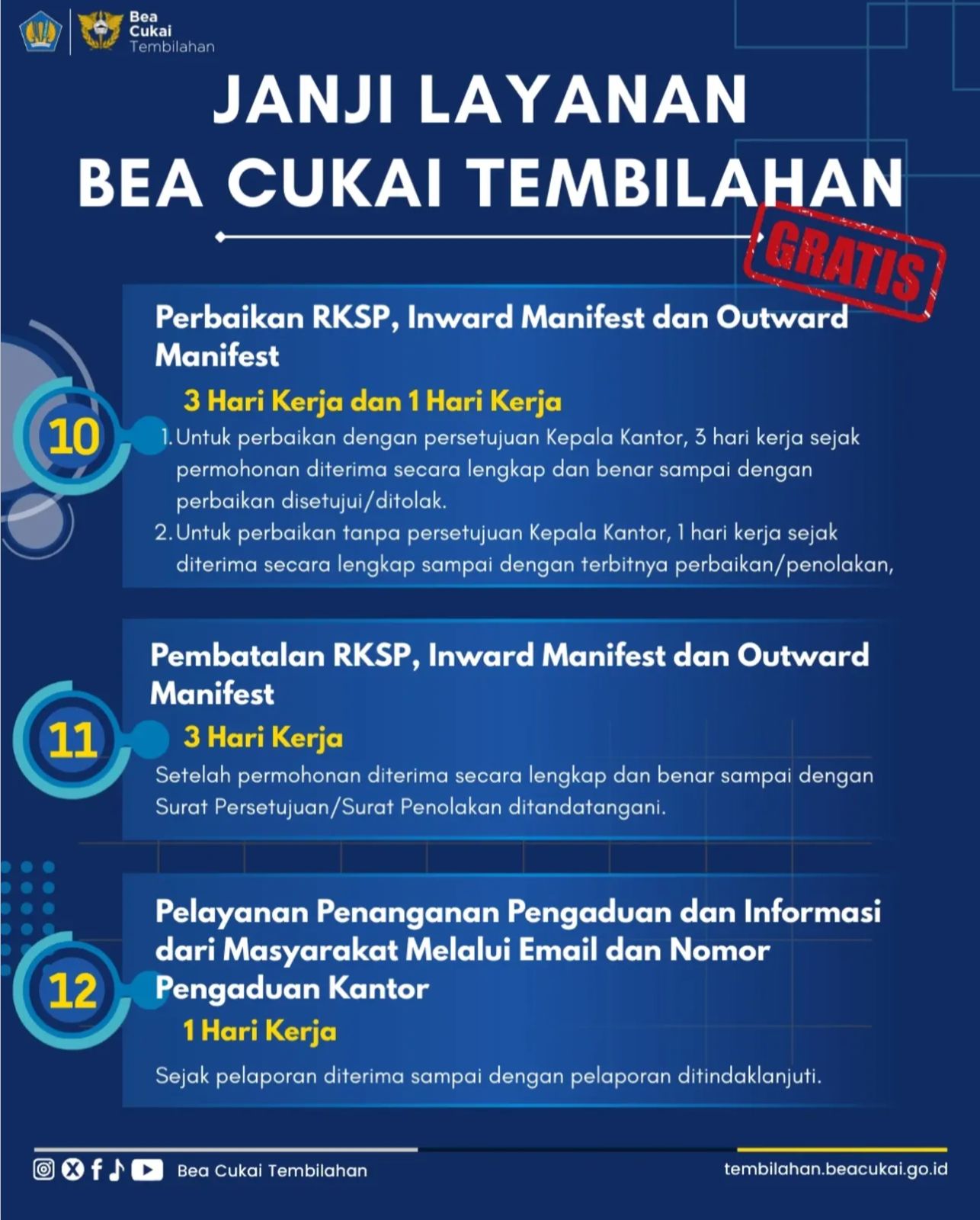 - Perbaikan RKSP, Inward/Outward Manifest: Selesai dalam 1 hingga 3 Hari Kerja (tergantung persetujuan Kepala Kantor).