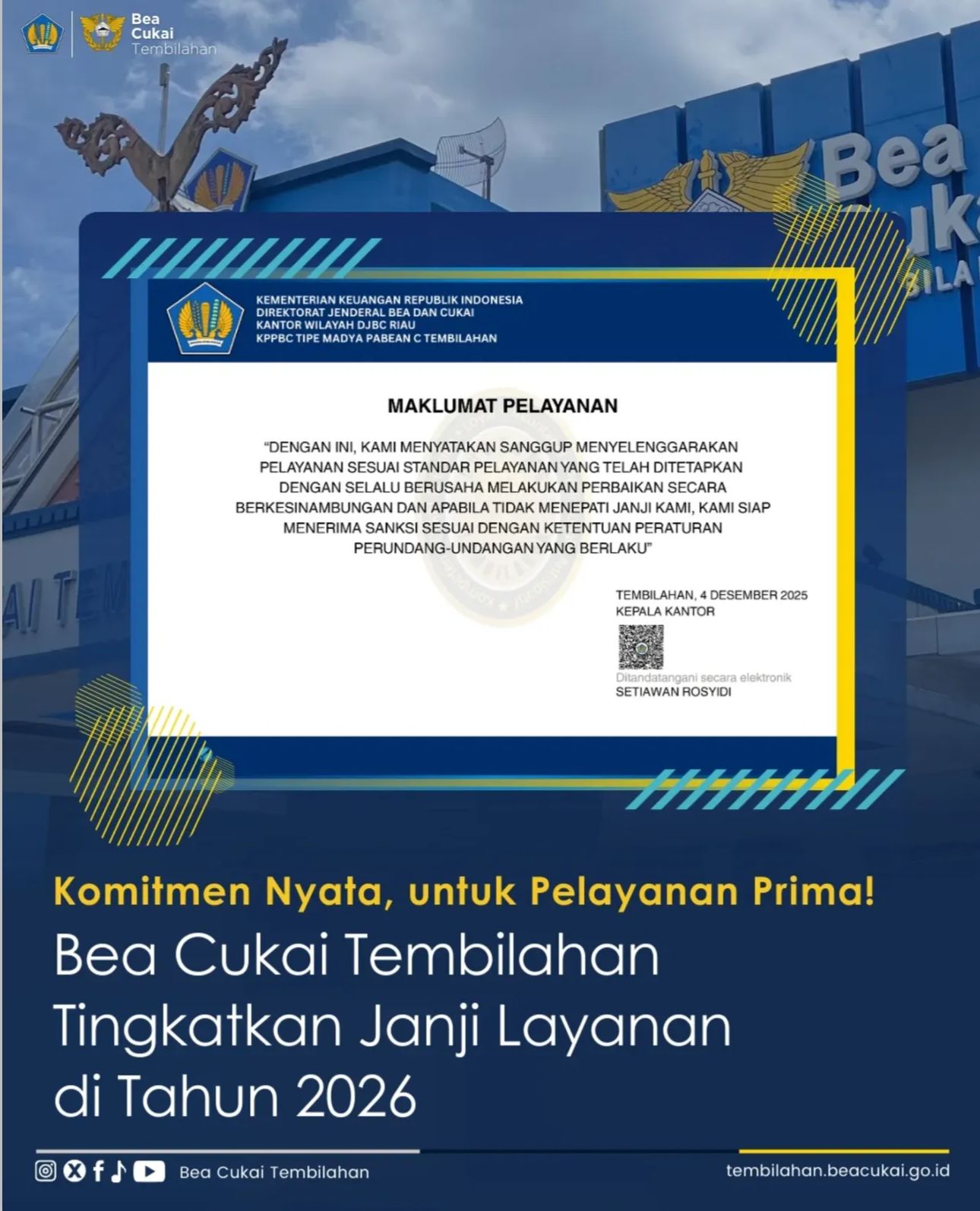 Kepala Kantor Bea Cukai Tembilahan, Setiawan Rosydi, menegaskan bahwa pembaruan ini didasarkan pada Keputusan Kepala Kantor nomor KEP-267/KBC.0303/2025 tanggal 28 November 2025. Standar pelayanan ini menjadi kontrak kerja transparan antara petugas Bea Cukai dengan pengguna jasa.